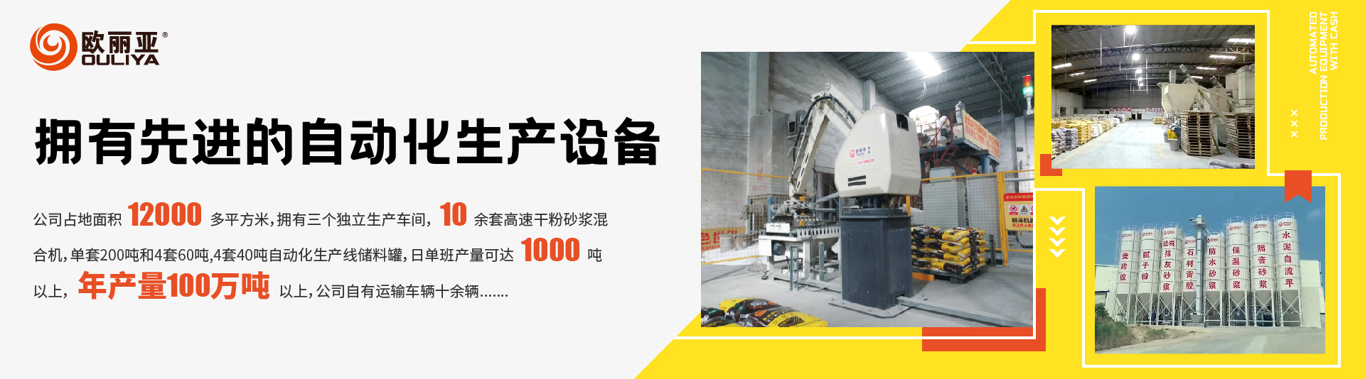 公司占地面積12000多平方米,擁有三個獨 立生產(chǎn)車間,10余套高速干粉砂漿混合機, 單套200噸和4套60噸,4套40噸自動化生產(chǎn)線